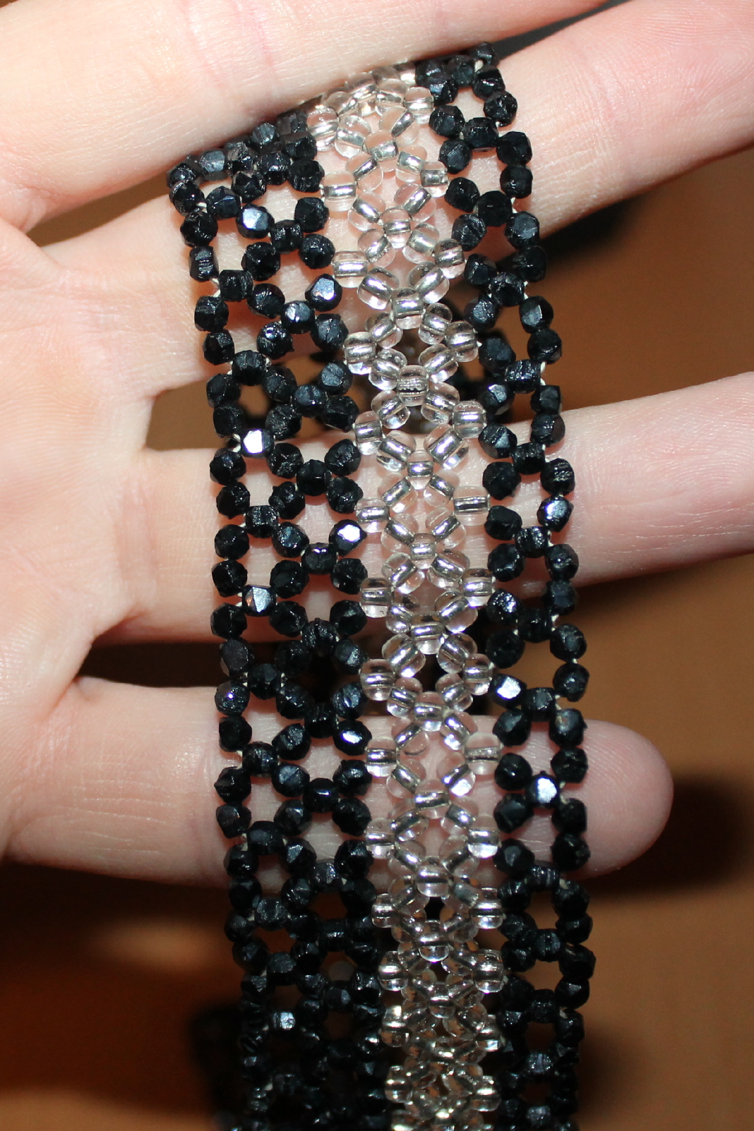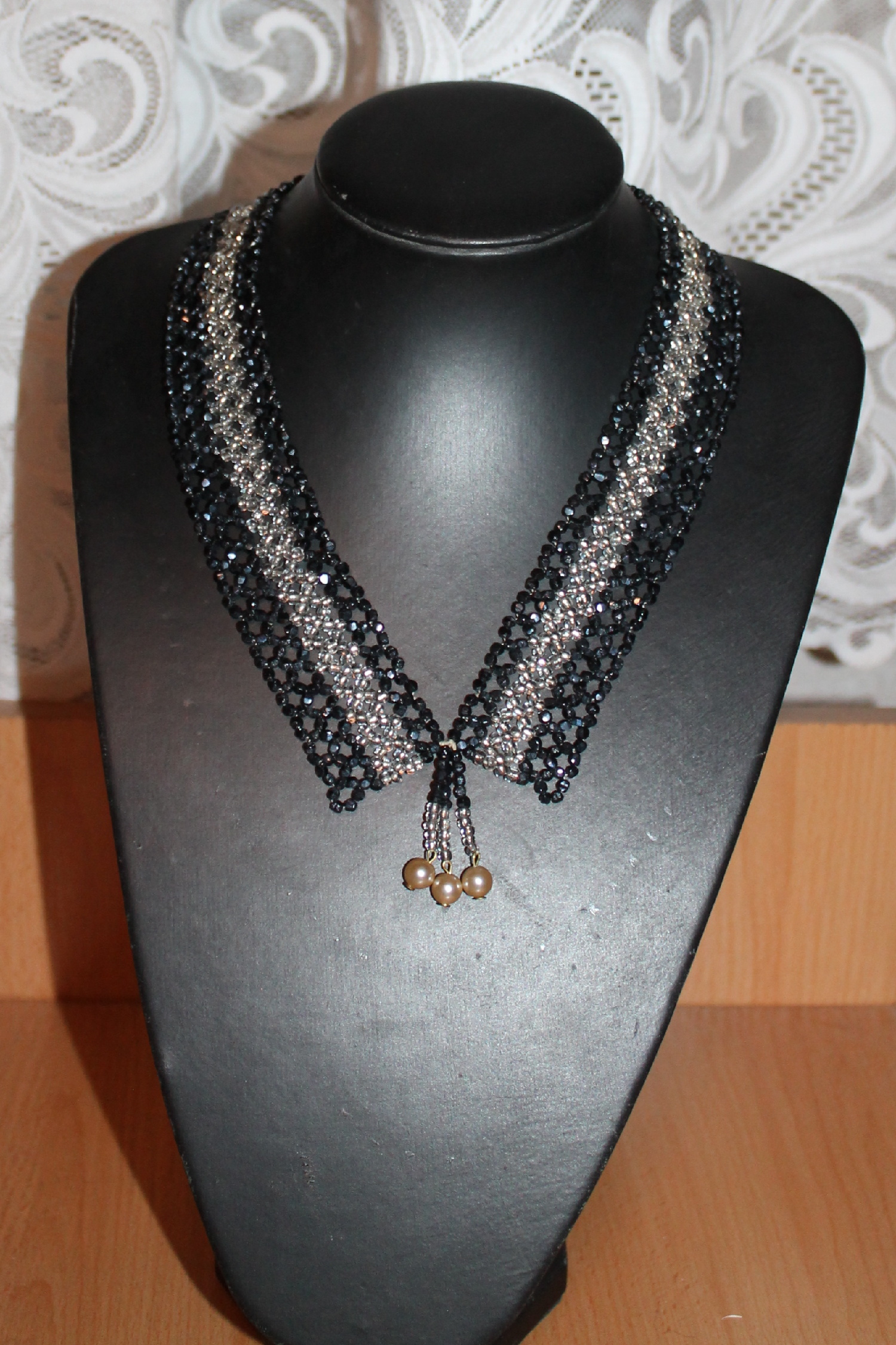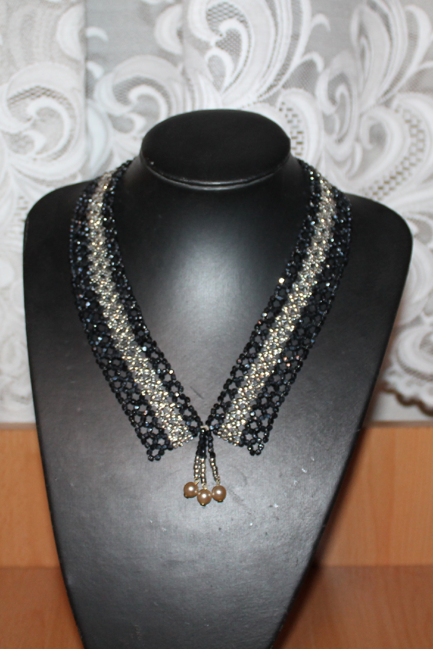 Vintage náhrdelník límečkového střihu je šitý z drobných broušených perlí dvou barev.