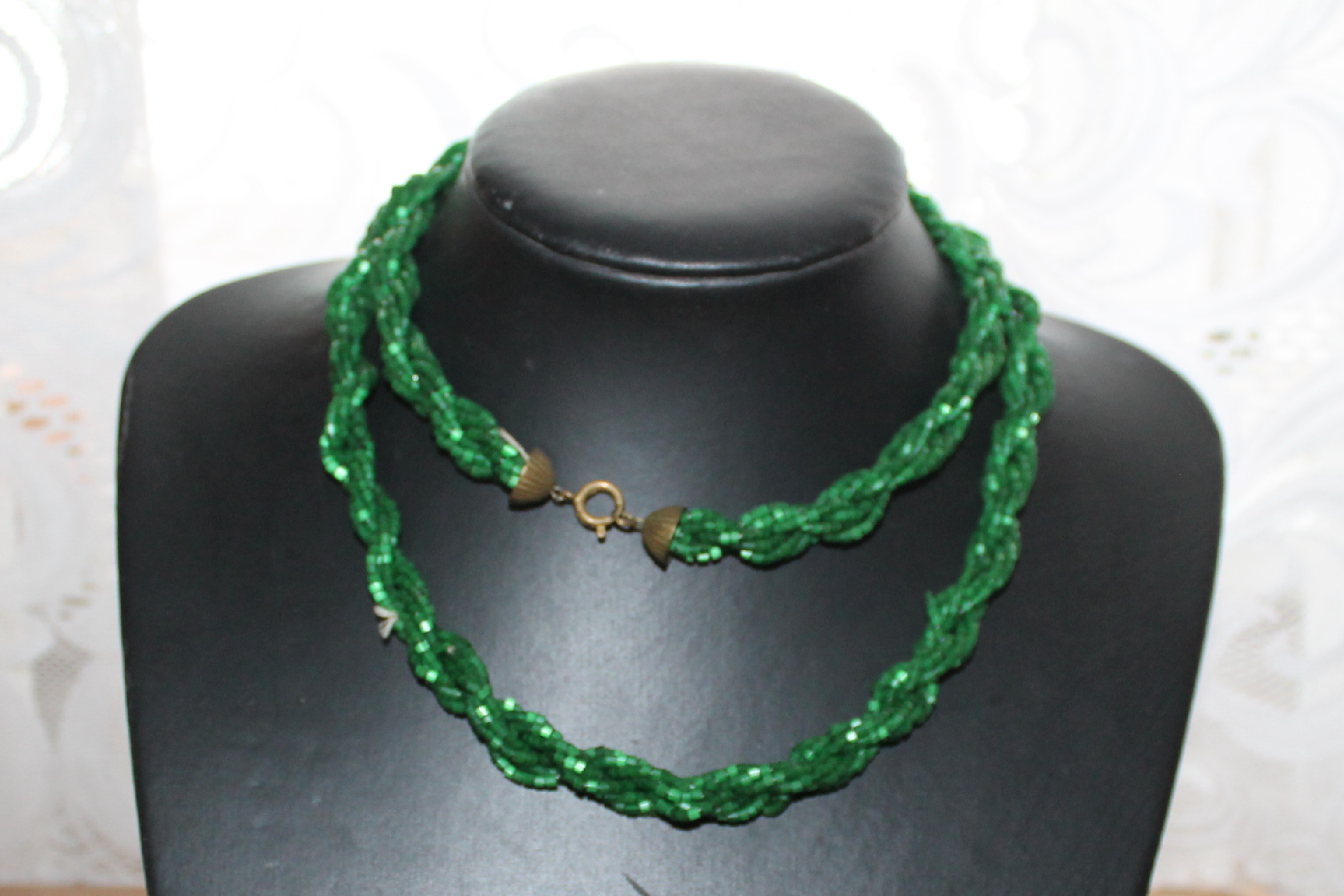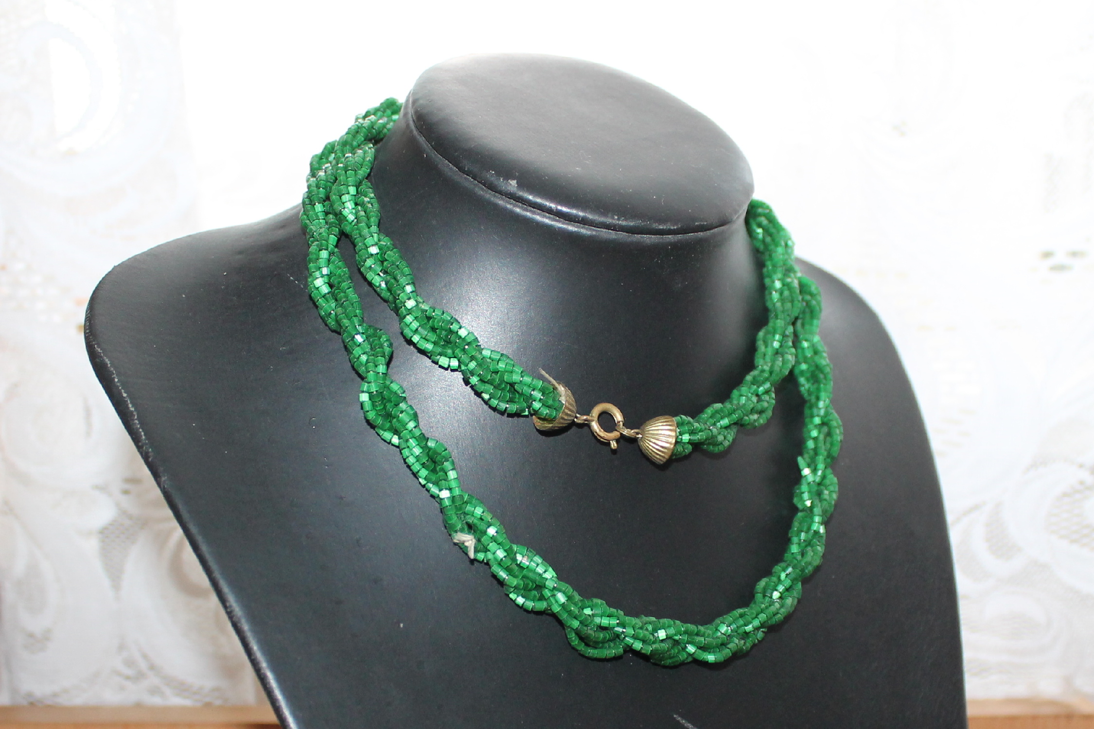 Vintage náhrdelník ze zeleného sekaného rokajlu. Čas na něm je znát, ale stále je to pěkný kousek.