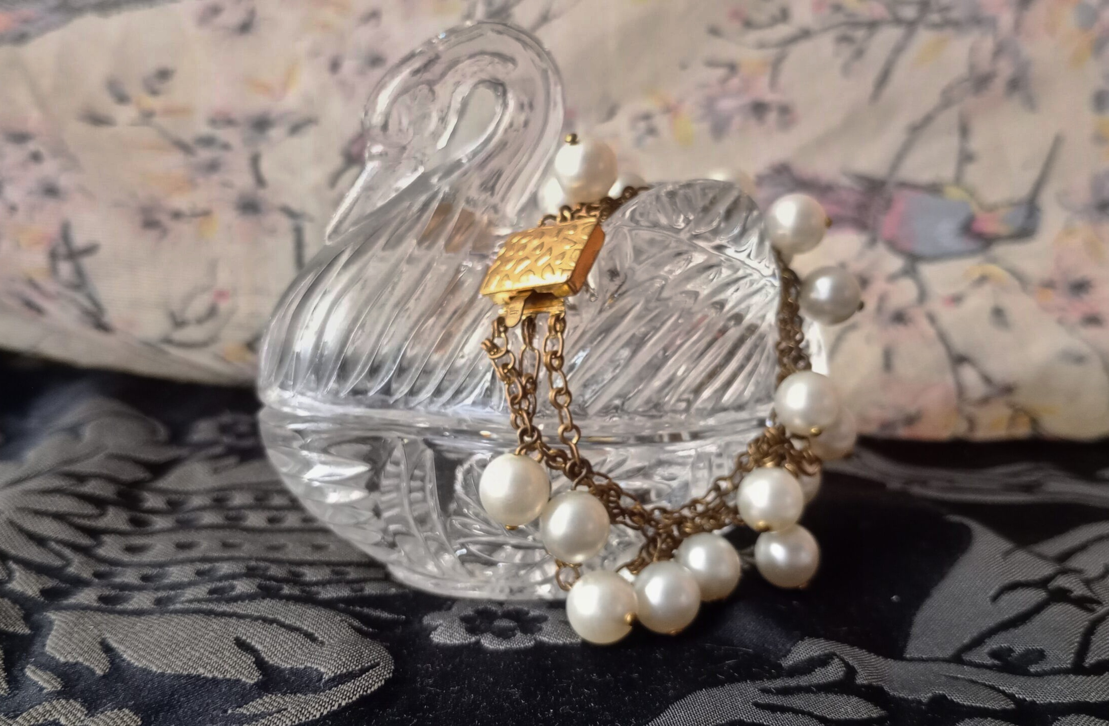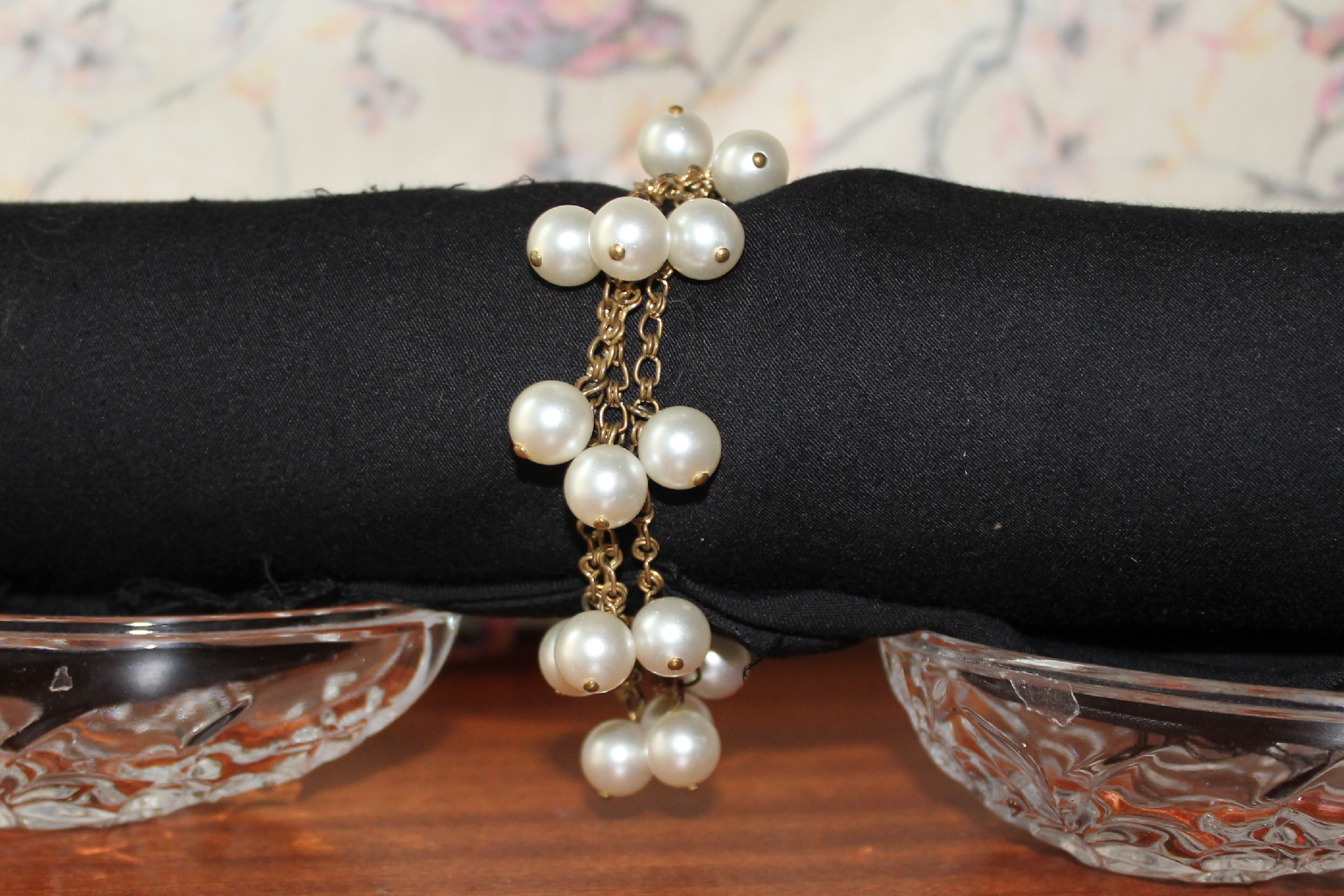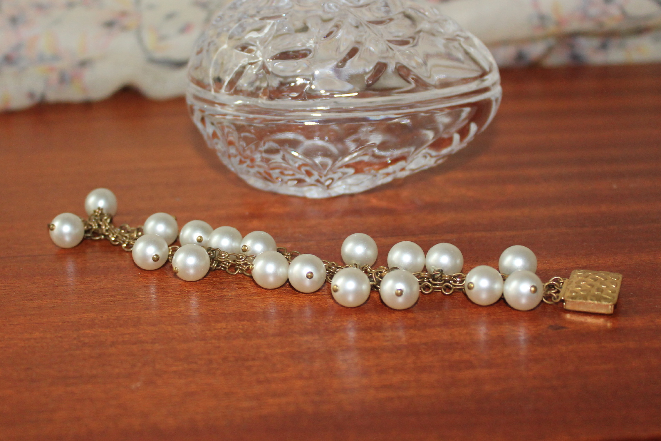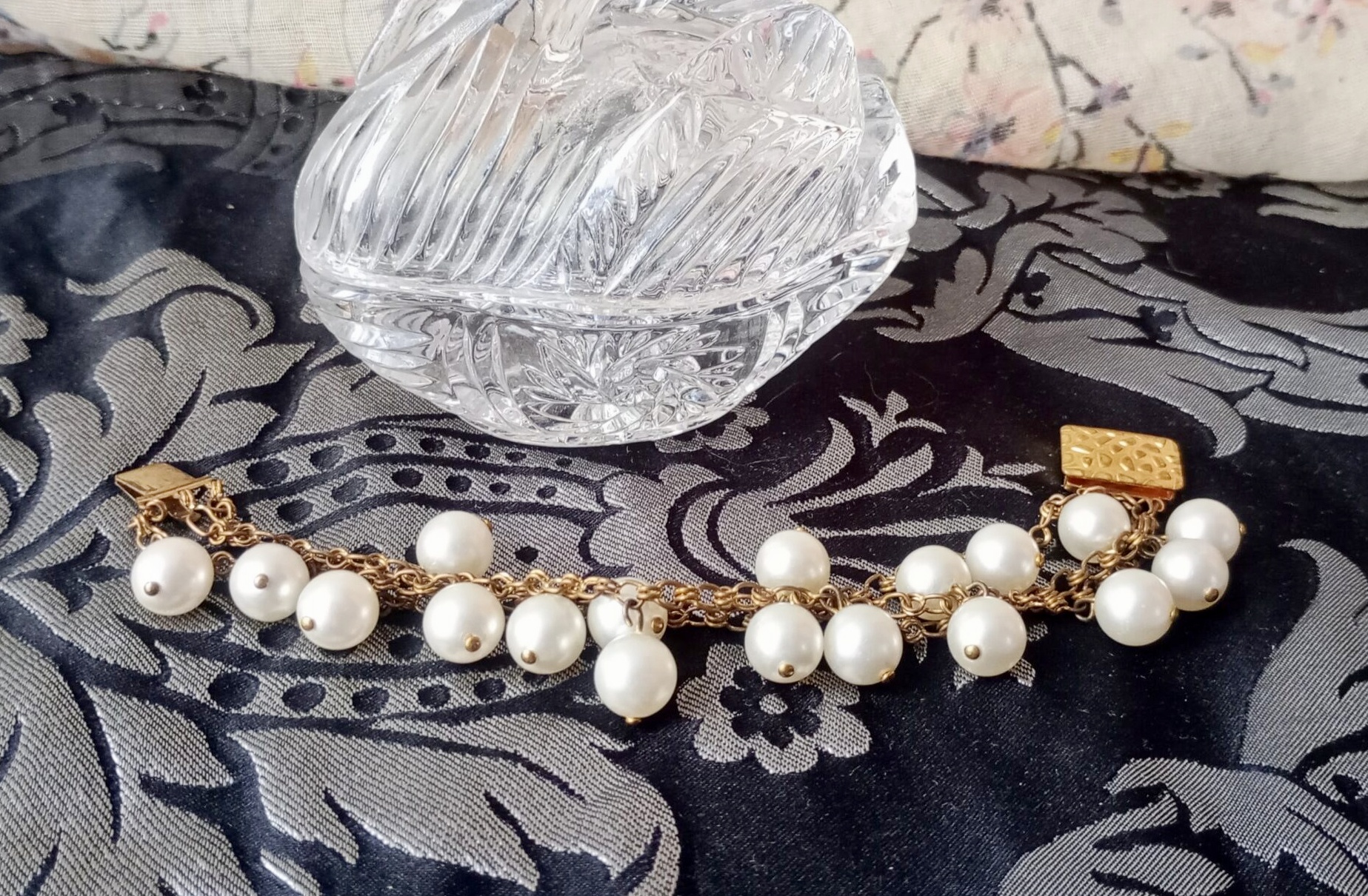 Nabízíme Vám ketlovaný vintage náramek ve zlatém provedení s voskovanými perlemi v bílé barvě.