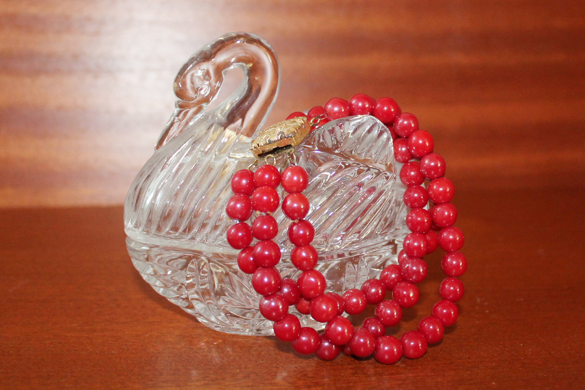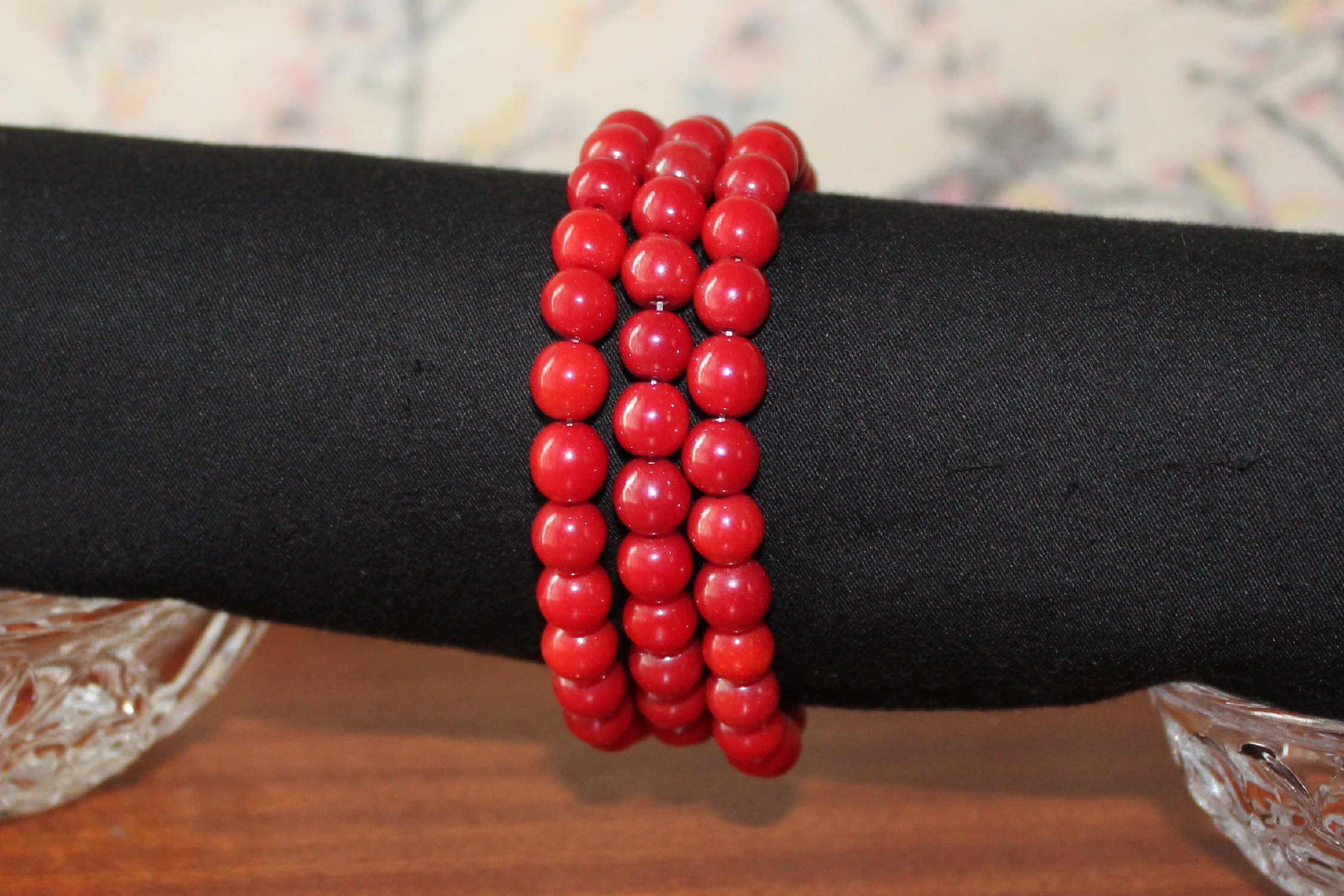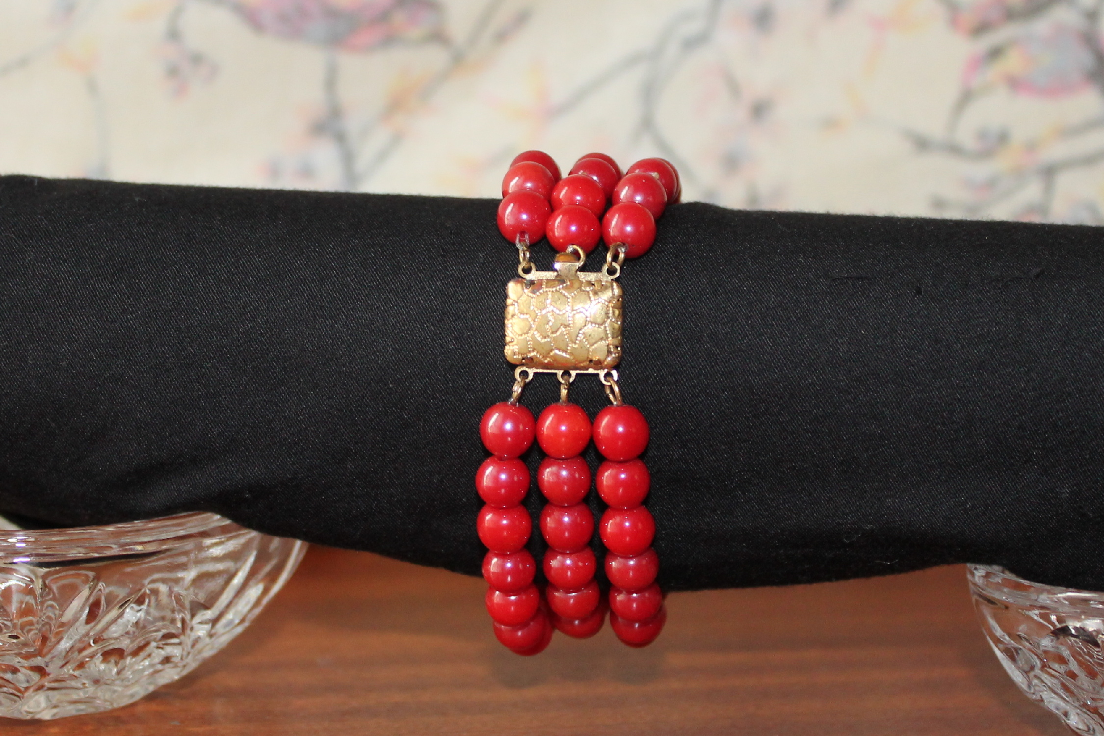 Nabízíme Vám třířadý vintage náramek z mačkaných perlí v krásně tmavé červené barvě.