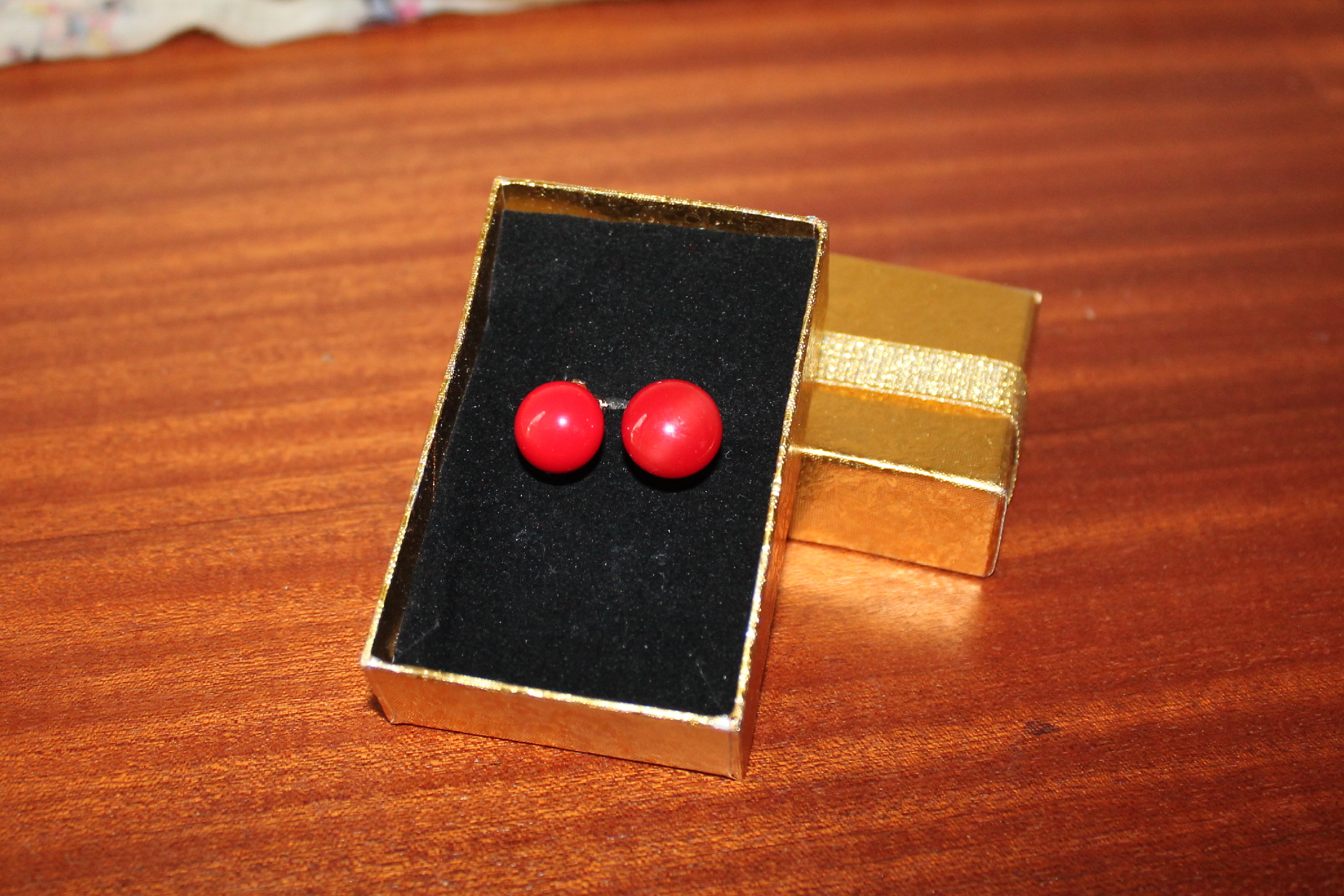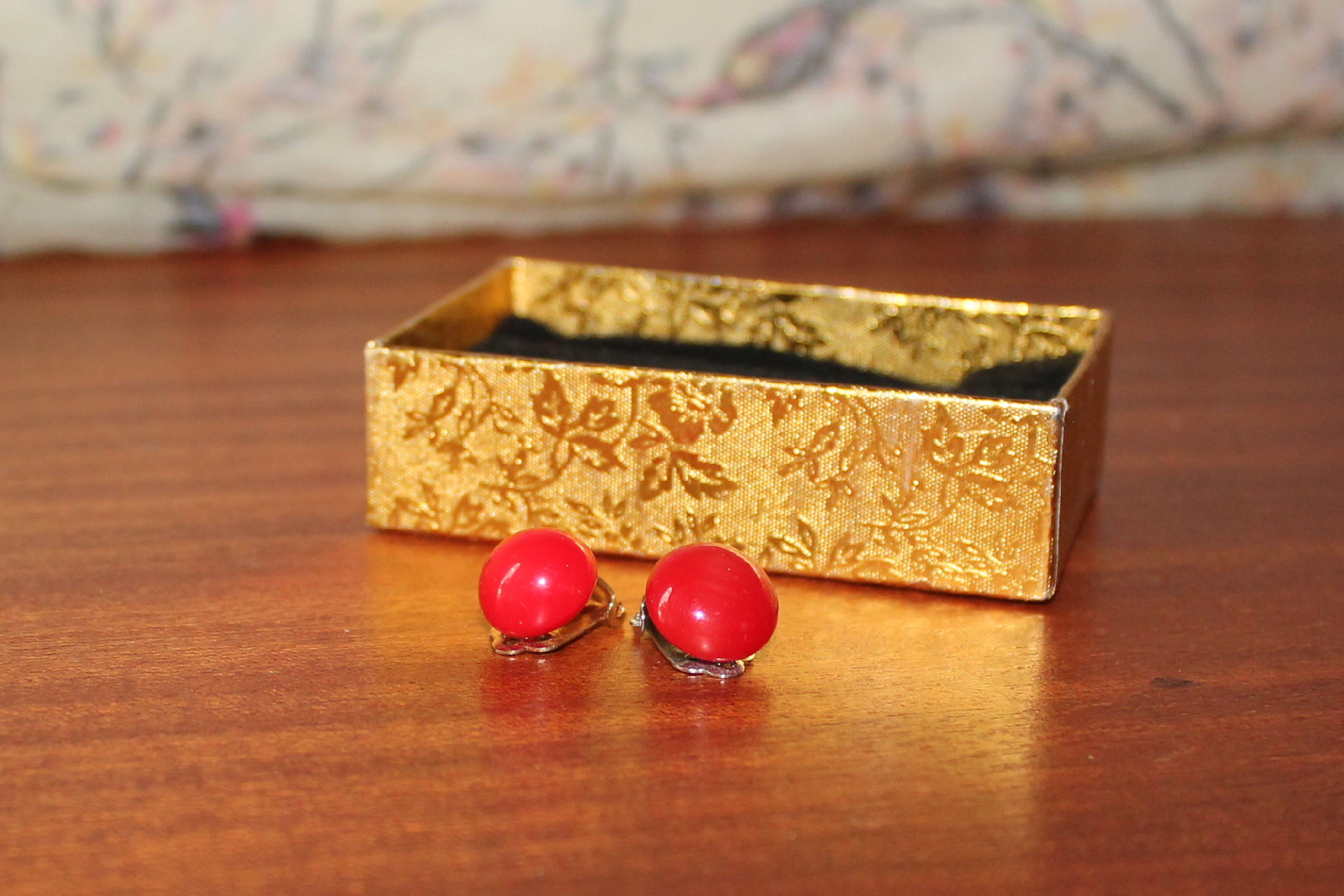 Nabízíme Vám vintage náušnice, klipsy v červené barvě. Odhadujeme na 80. léta minulého století.